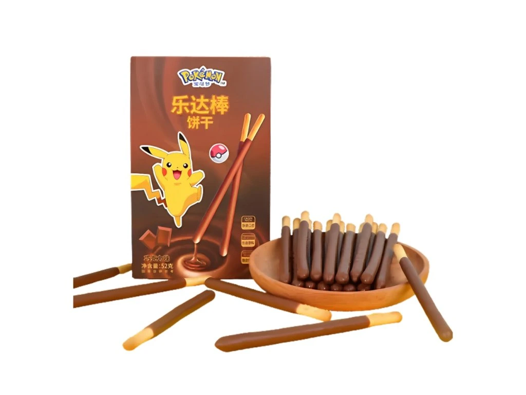 Biscoitos em formato de palitos crocantes cobertos com chocolate, inspirados no universo Pokémon. Um snack divertido e prático, perfeito para fãs e para pequenas pausas doces.